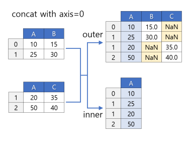 - ‘outer’ : 모든 행과 열 합치기 (기본값)